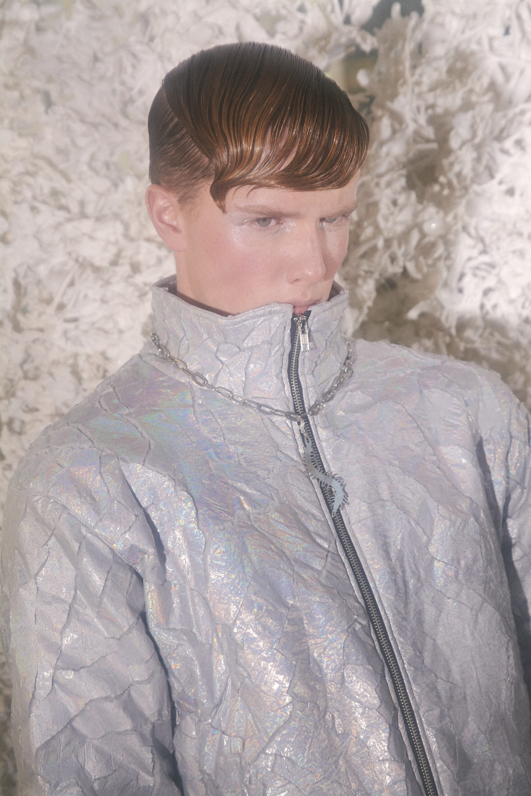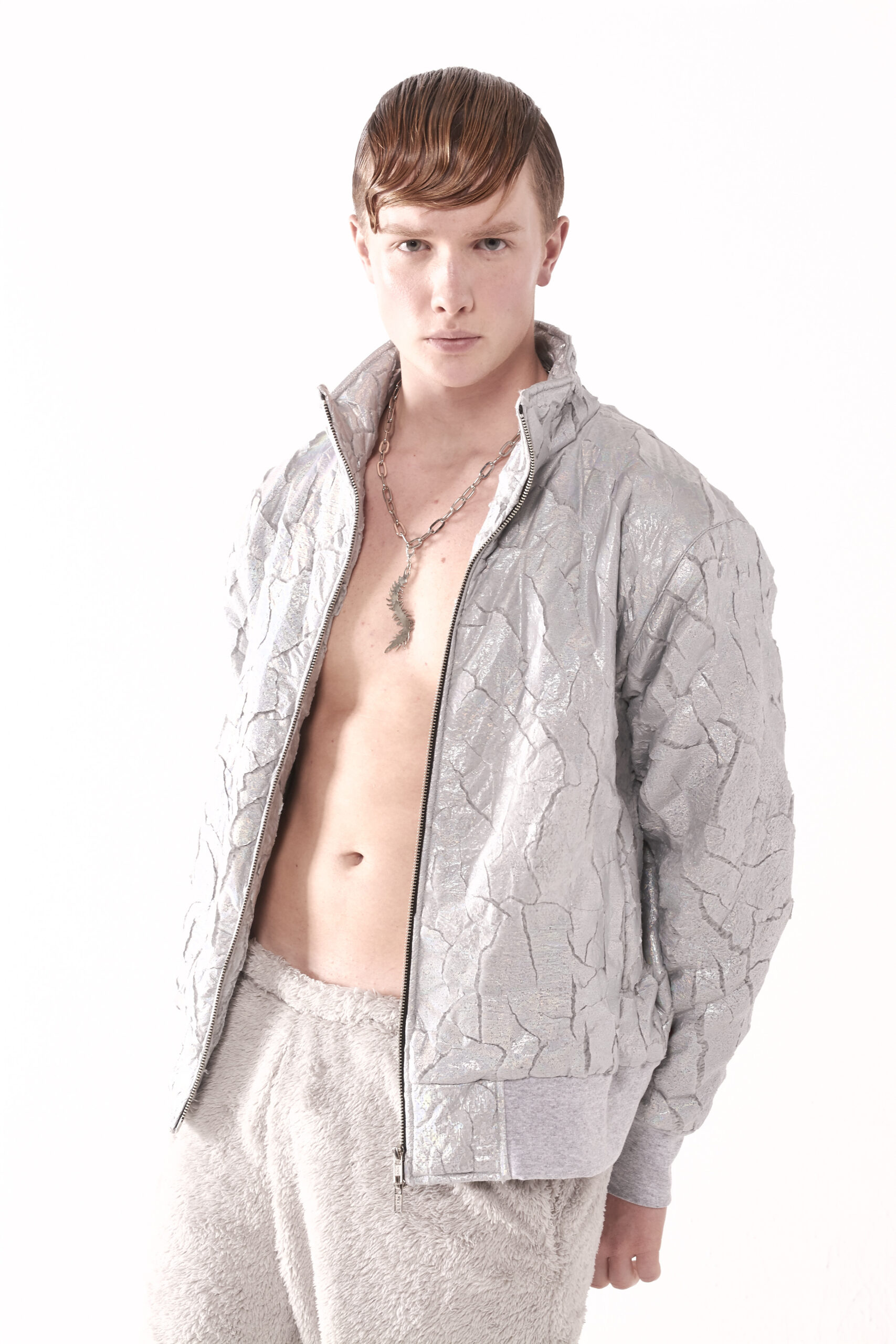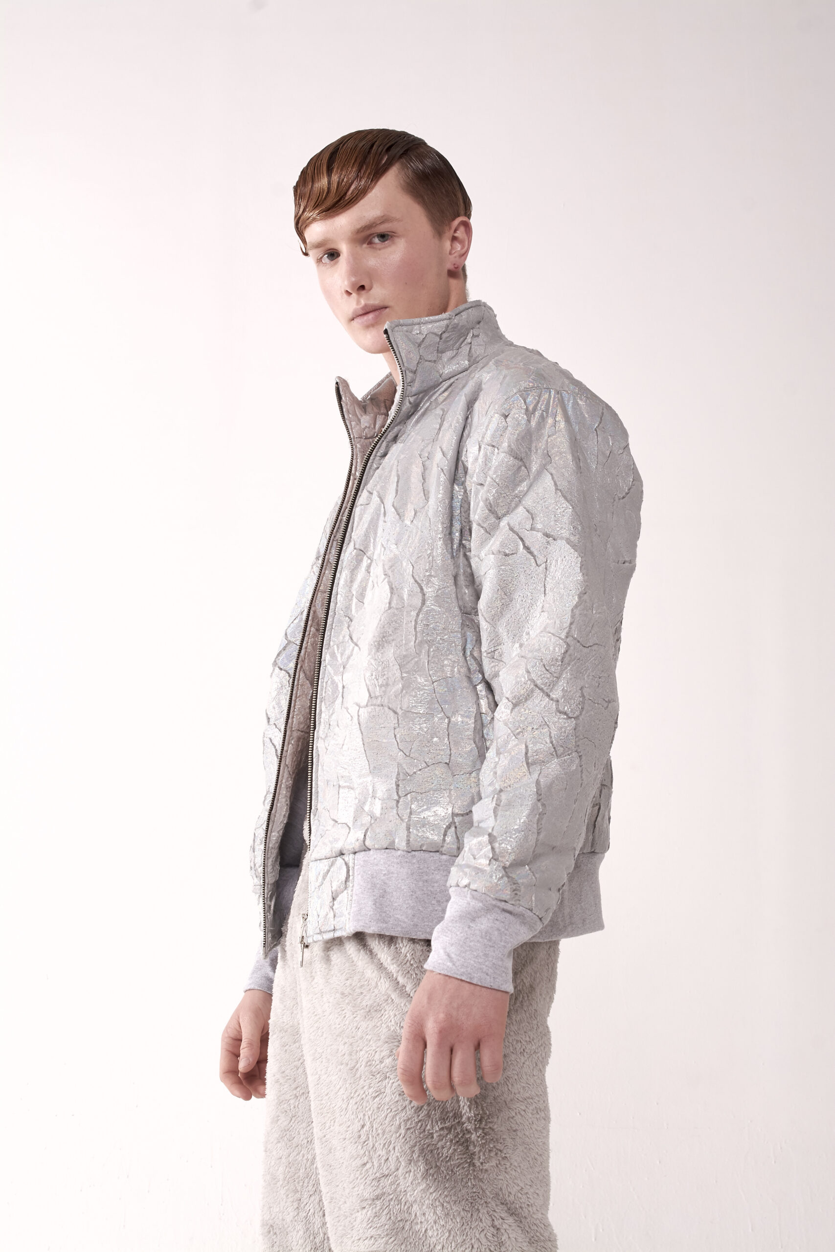 Campera tipo bomber. El textil base es de algodón, tuvo un tratamiento craquelado con con un ligero efecto tornasol. Su interior es de algodón, posee dos bolsillos en el delantero y acceso mediante cierre con doble deslizador. Textil artesanal creado por Bruno Giordano para esta colección.