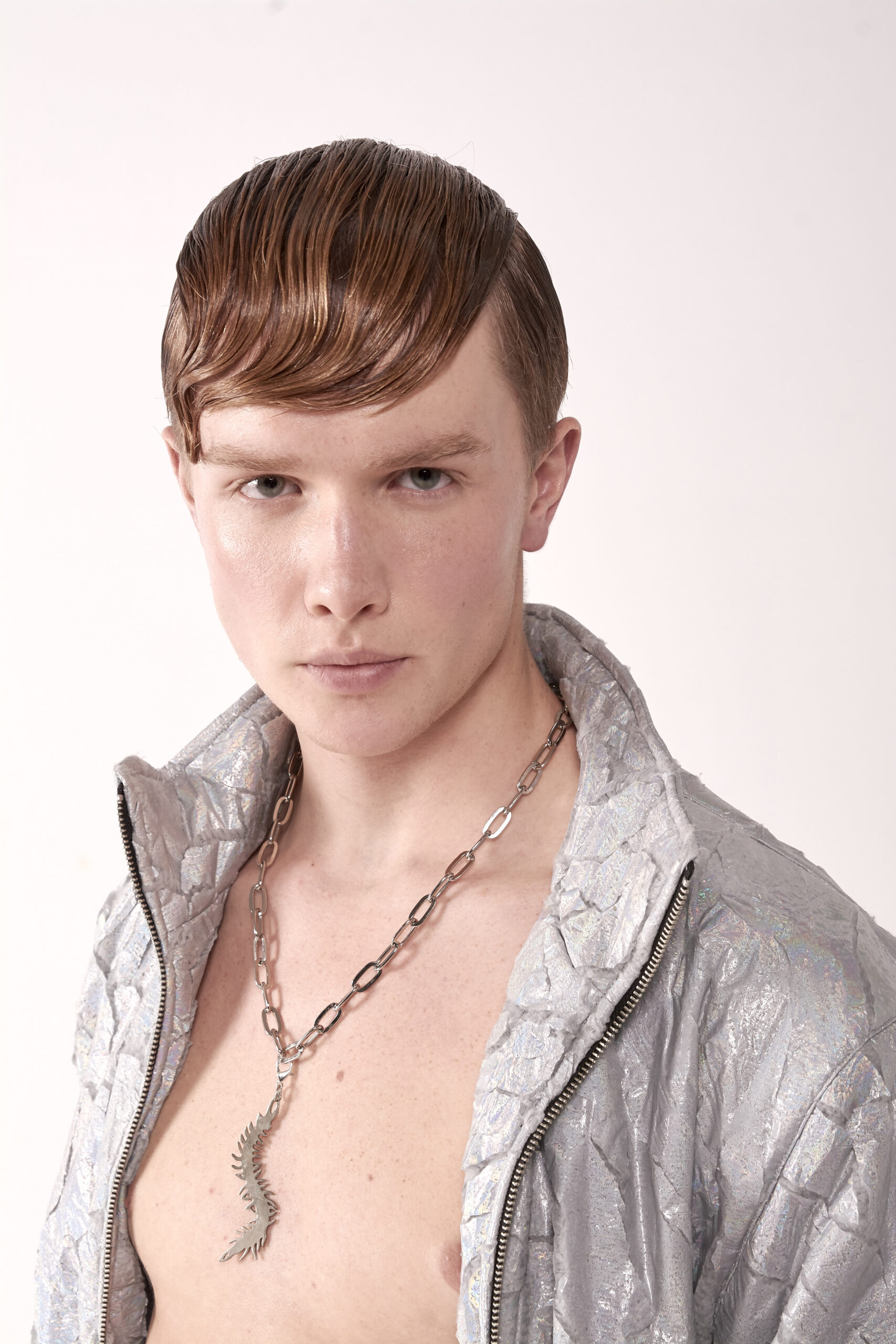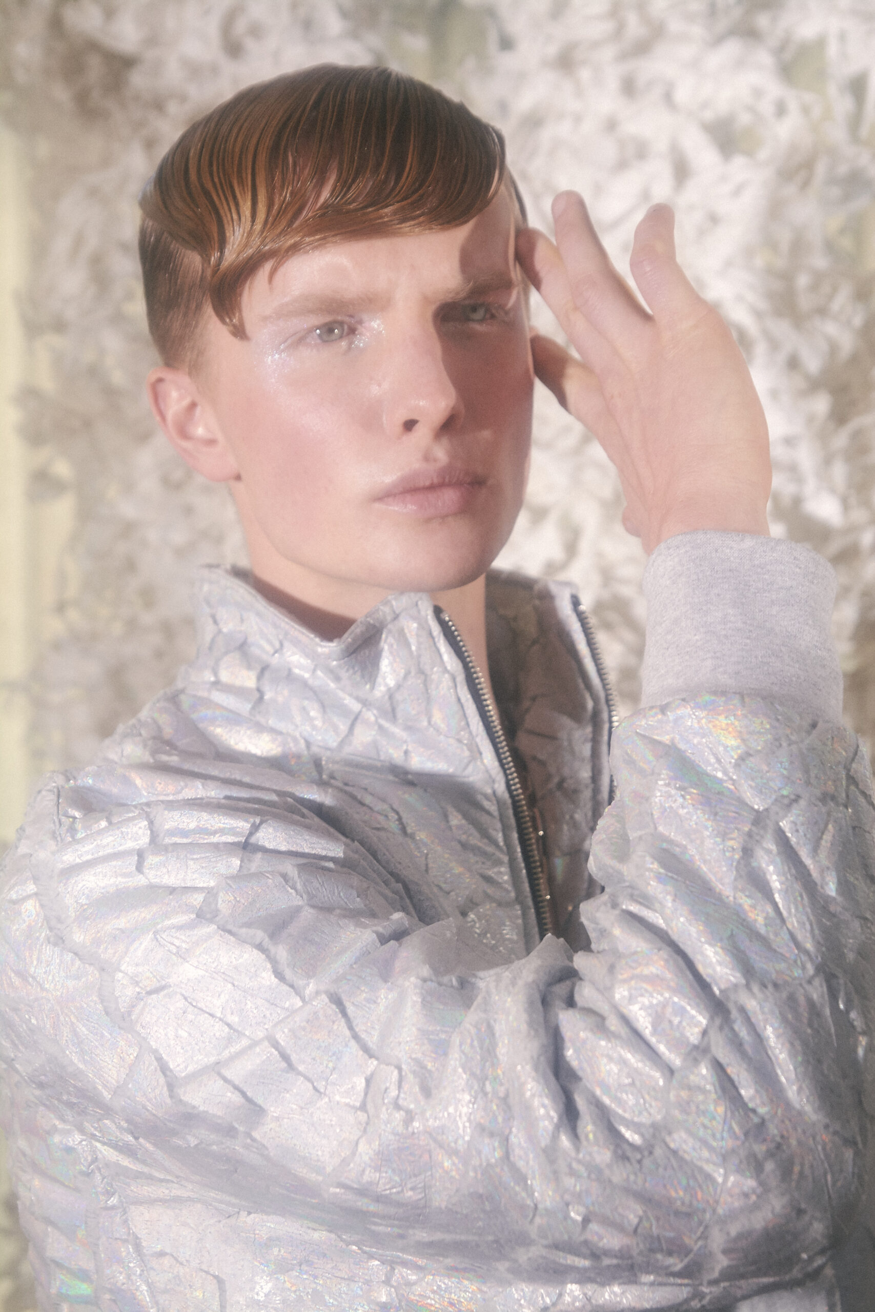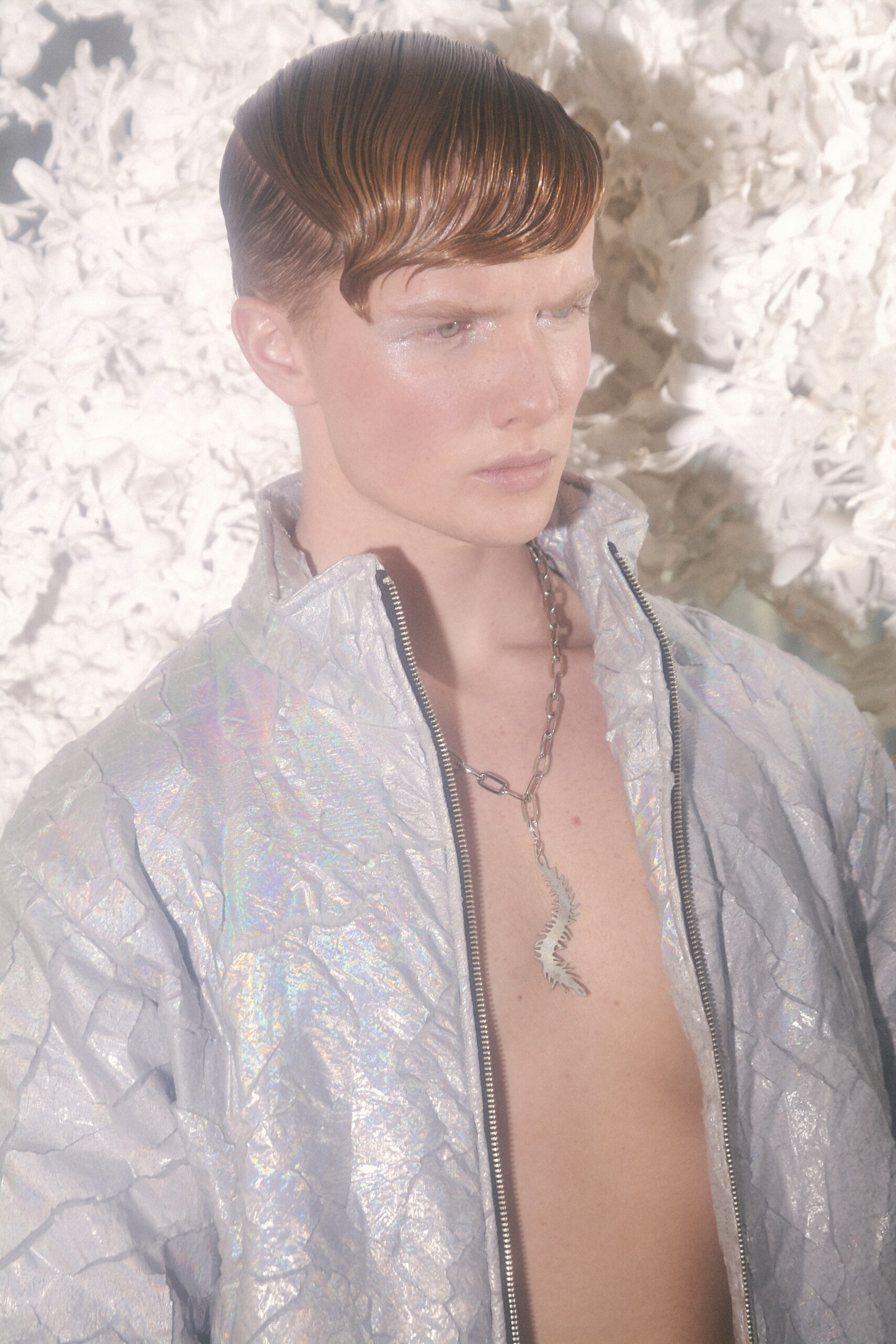 Campera tipo bomber. El textil base es de algodón, tuvo un tratamiento craquelado con con un ligero efecto tornasol. Su interior es de algodón, posee dos bolsillos en el delantero y acceso mediante cierre con doble deslizador. Textil artesanal creado por Bruno Giordano para esta colección.