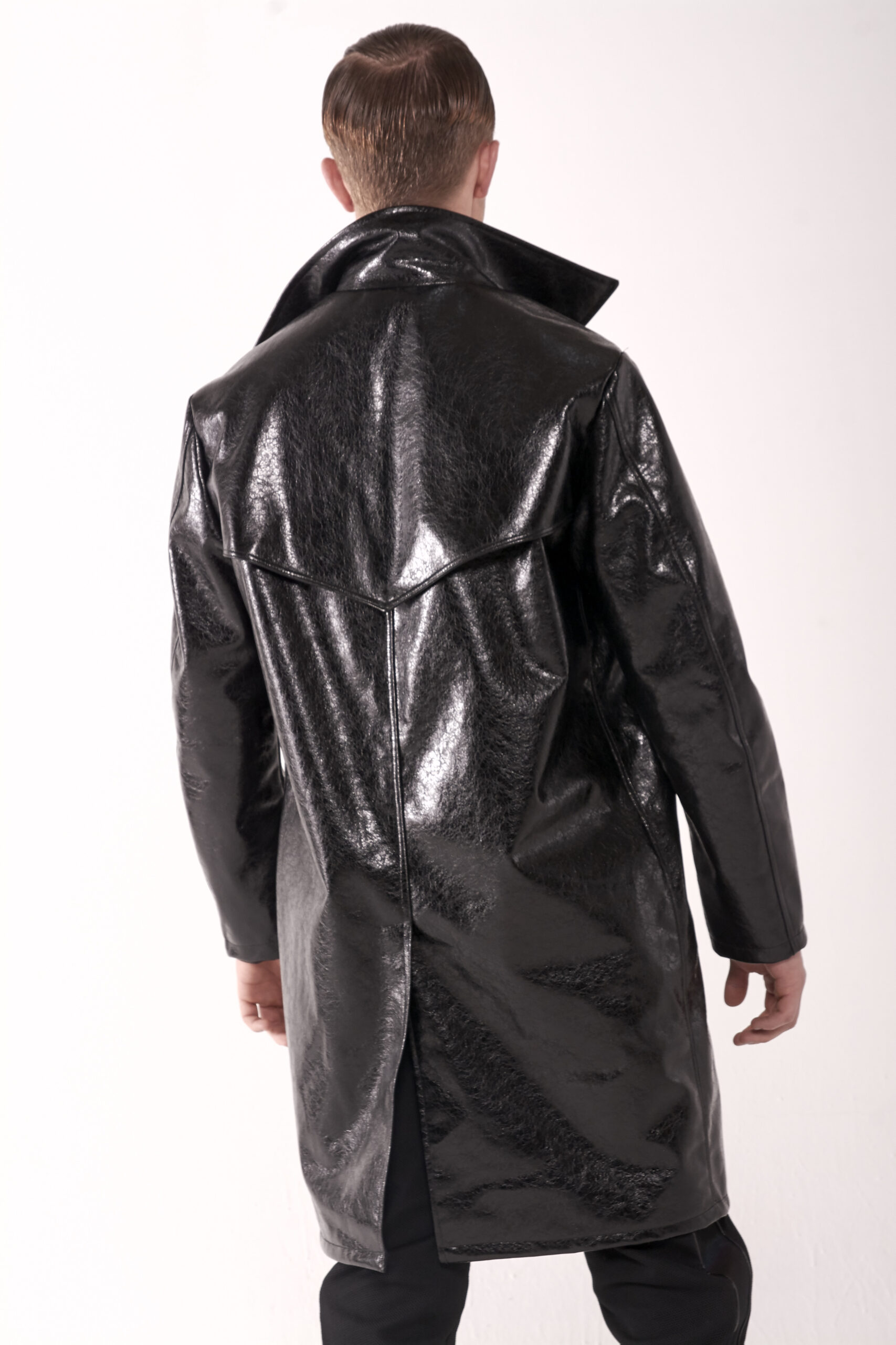 Tapado unisex en simil cuero arrugado con leve brillo. Posee dos bolsillos frontales, acceso mediante cierre metálico al tono y tajo en espalda.